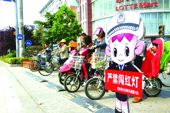 交警部门在路口放置卡通交警公...