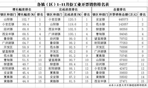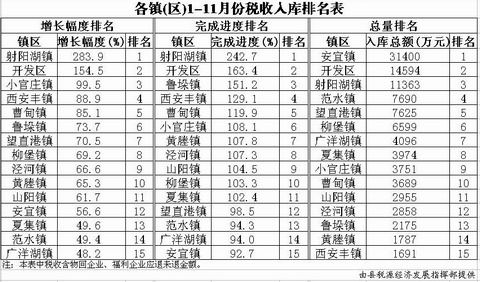 各镇(区)1-11月份税收入库排名表