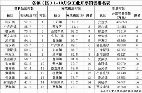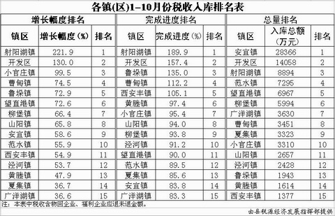 各镇(区)1-10月份税收入库排名表