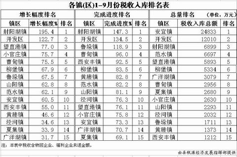 各镇(区)1-9月份税收入库排名表