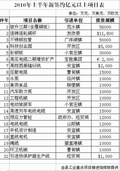 2010年上半年新签约亿元以上项目