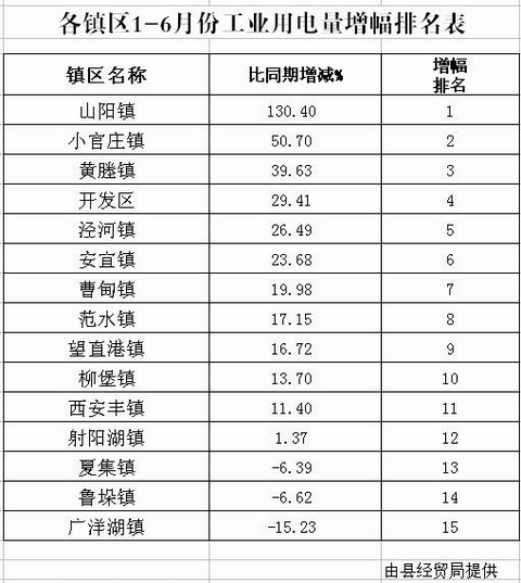 各镇区1-6月份工业用电量增幅...