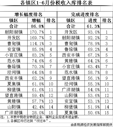 各镇区1-6月份税收排名表