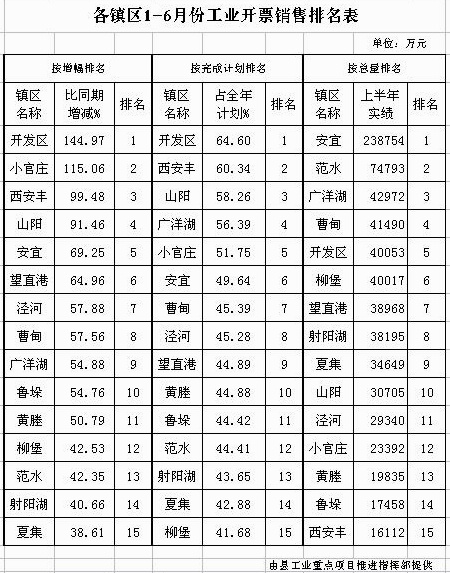 各镇区1-6月份工业开票销售排名