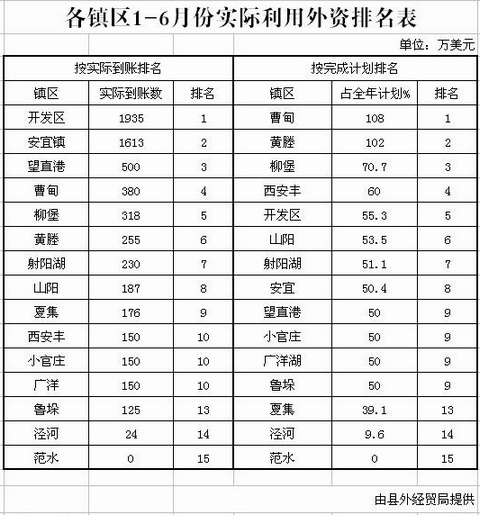 各镇区1-6月份实际利用外资排名